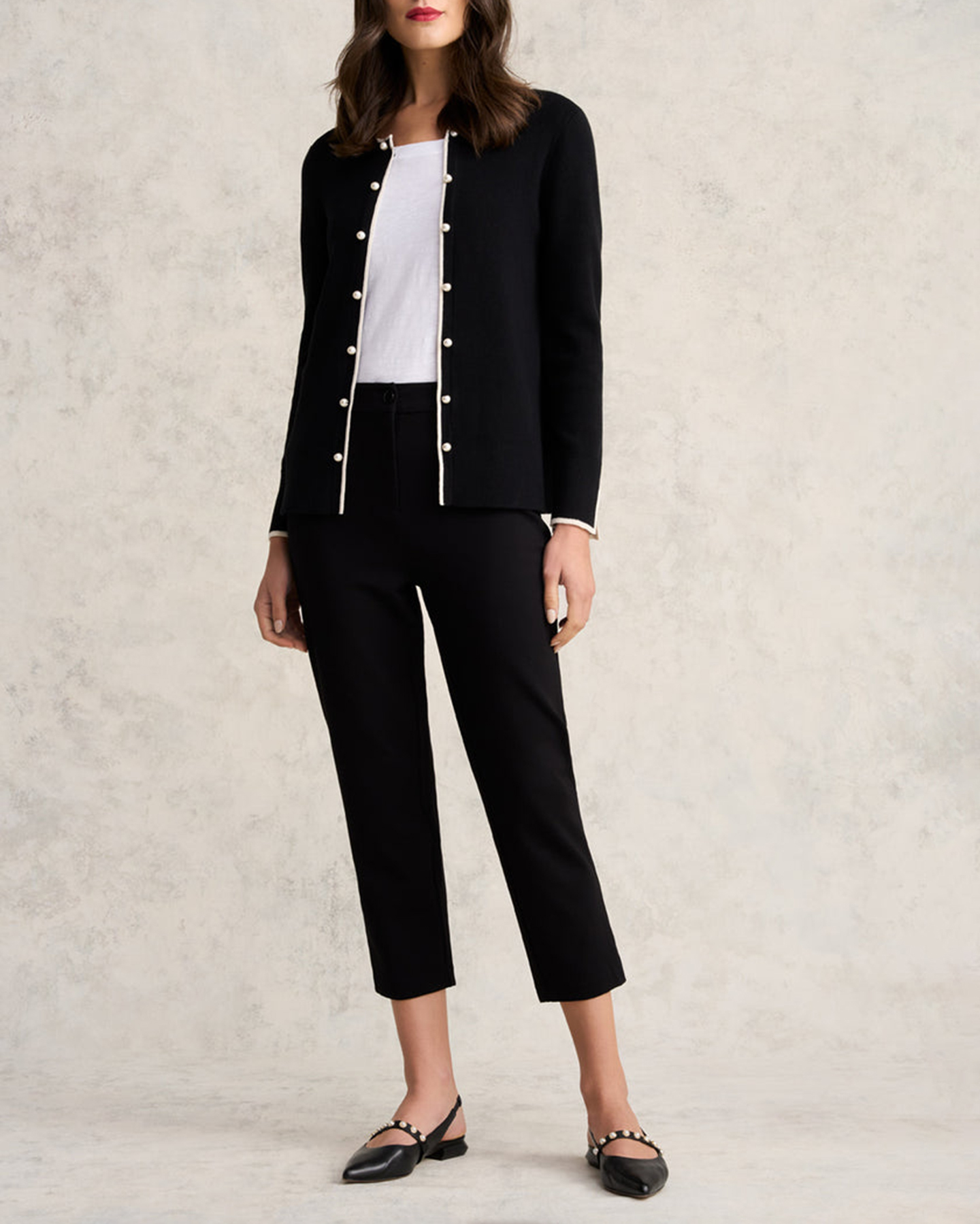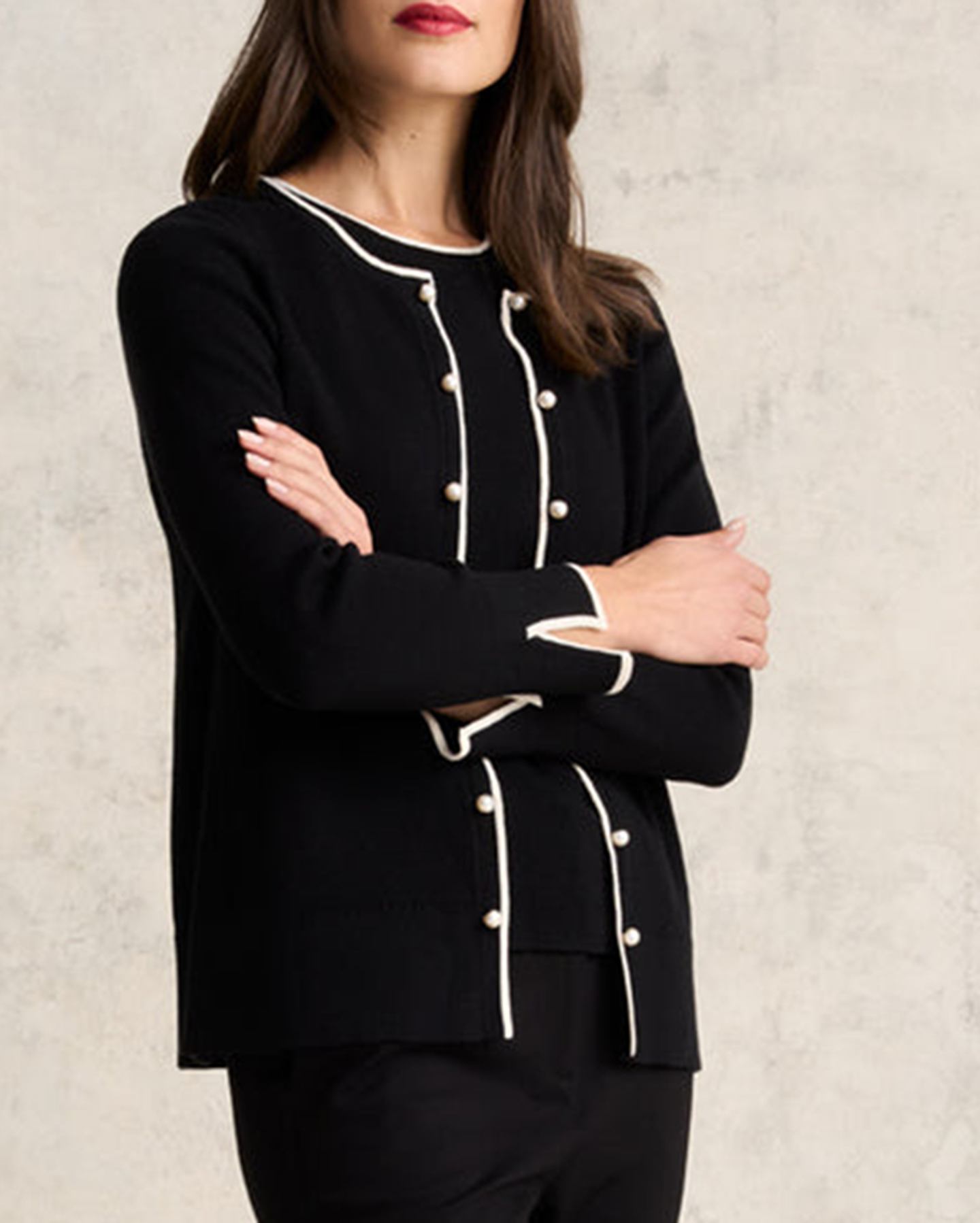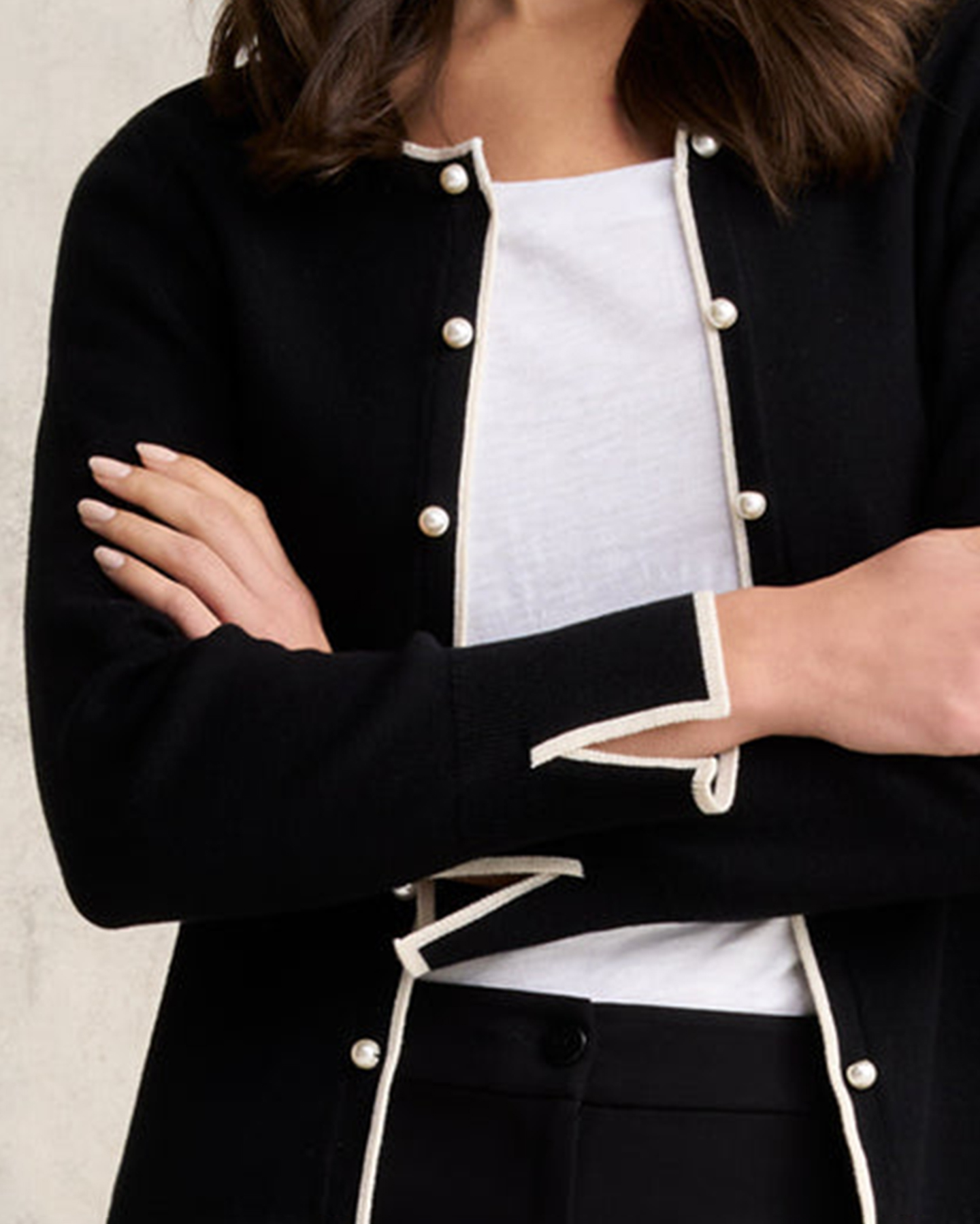 - Faux pearl decoration down centre front