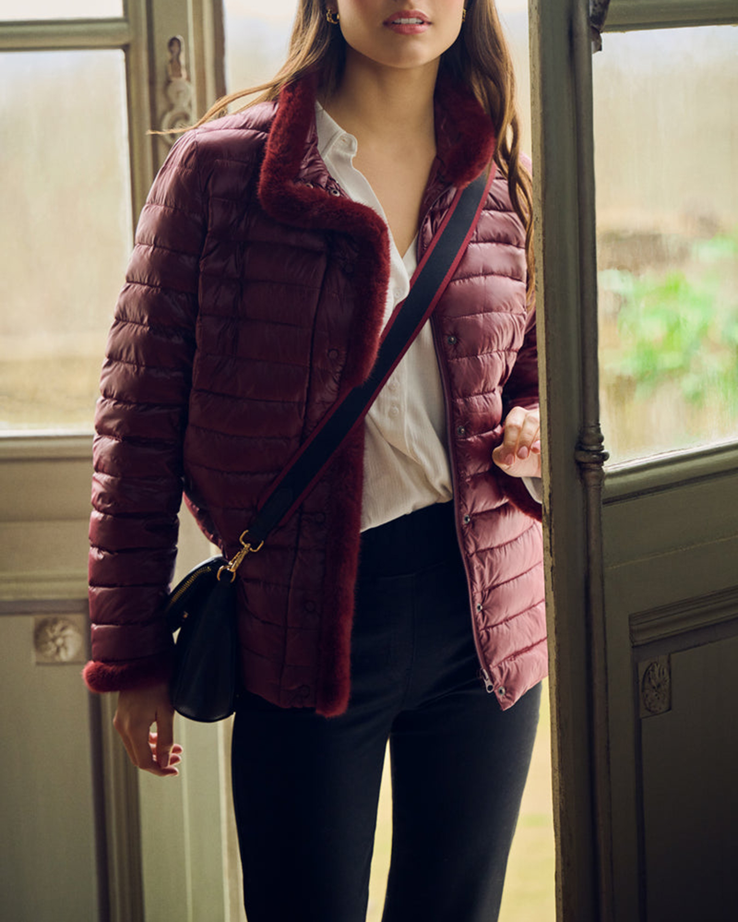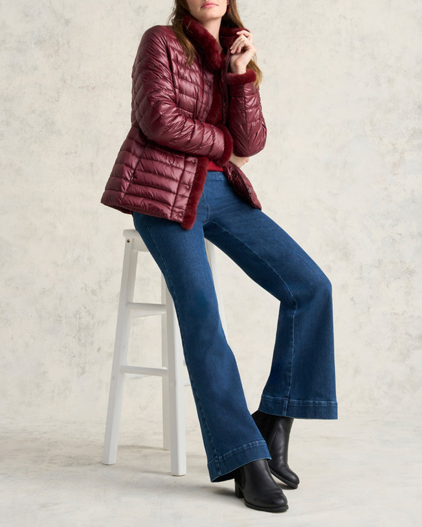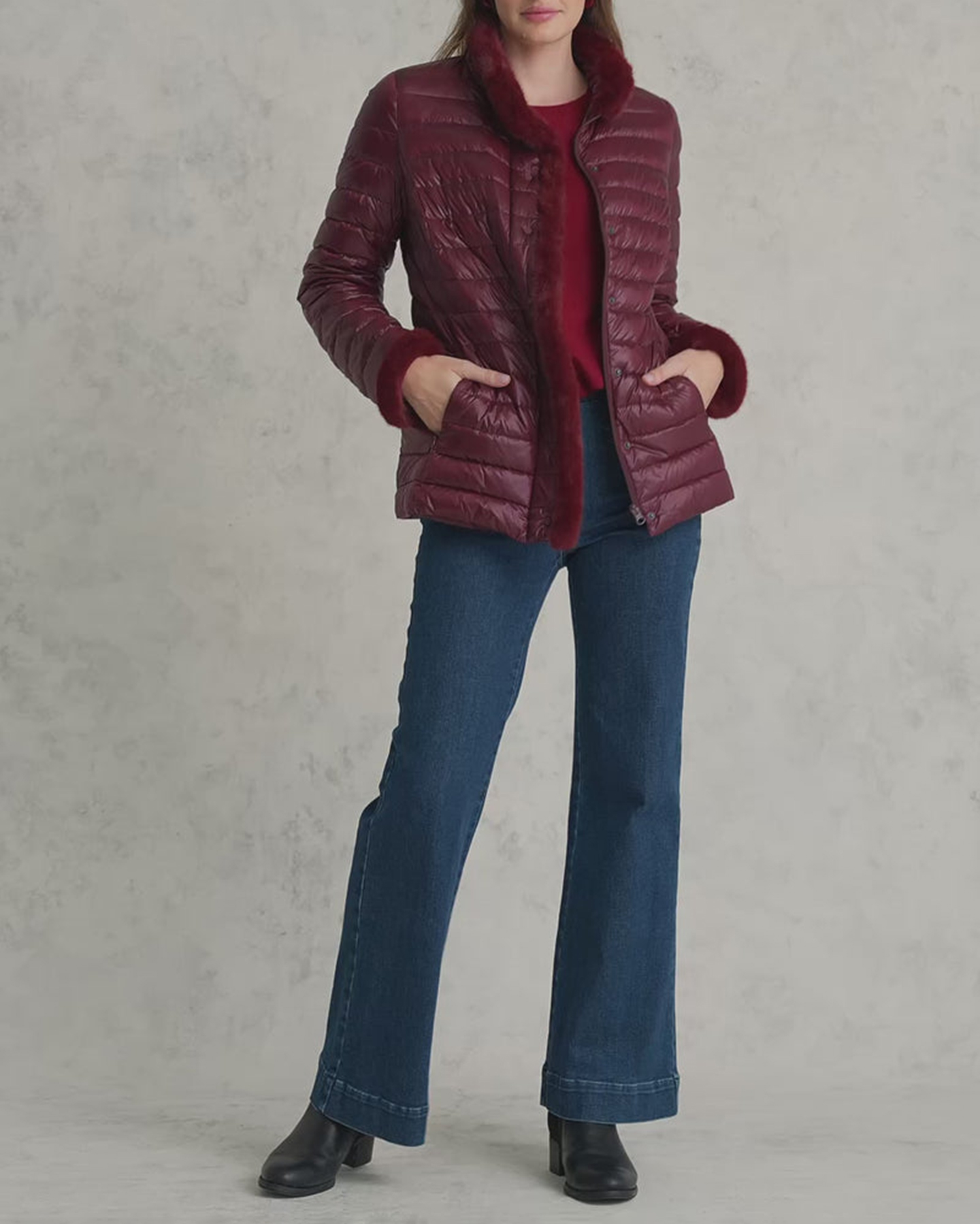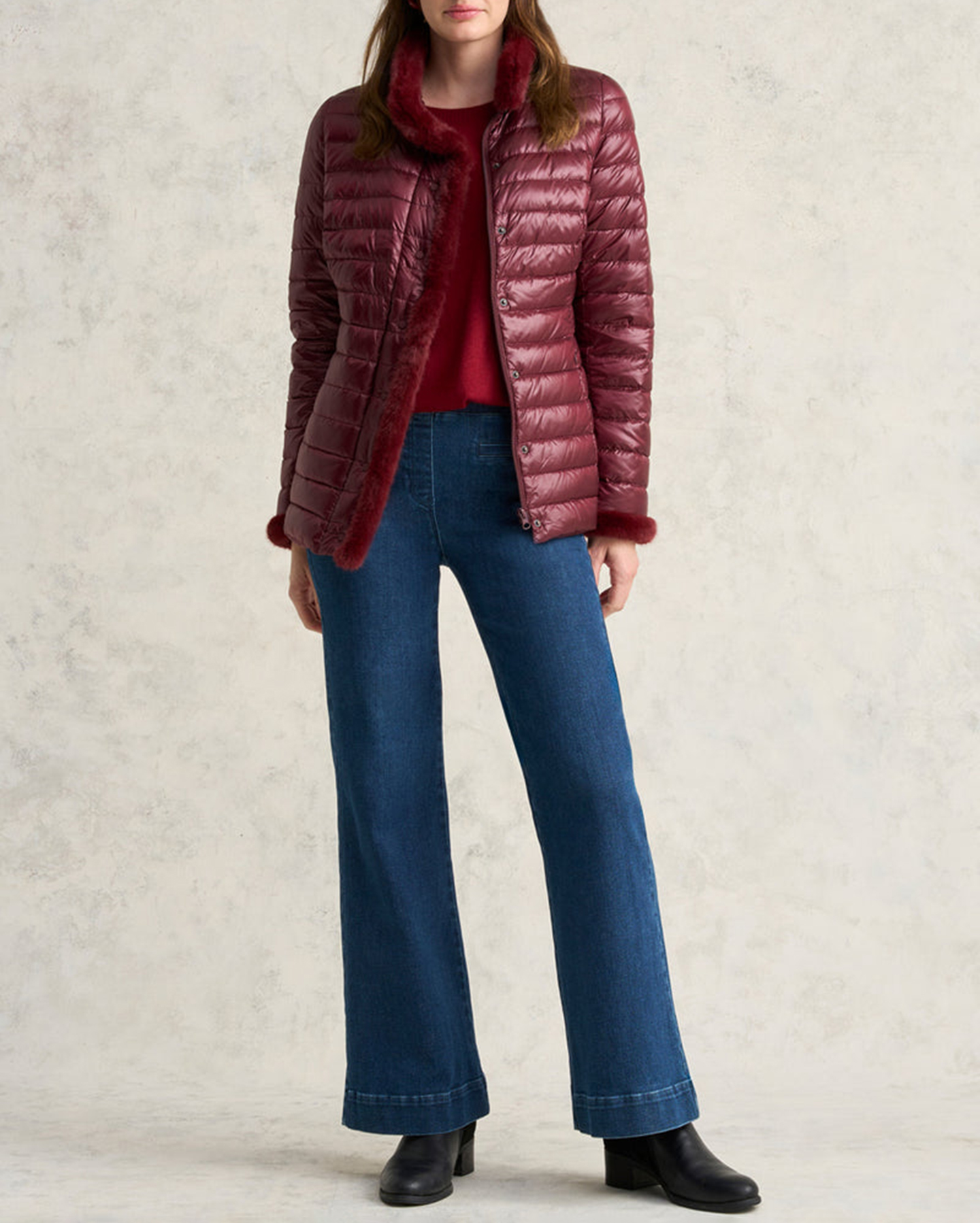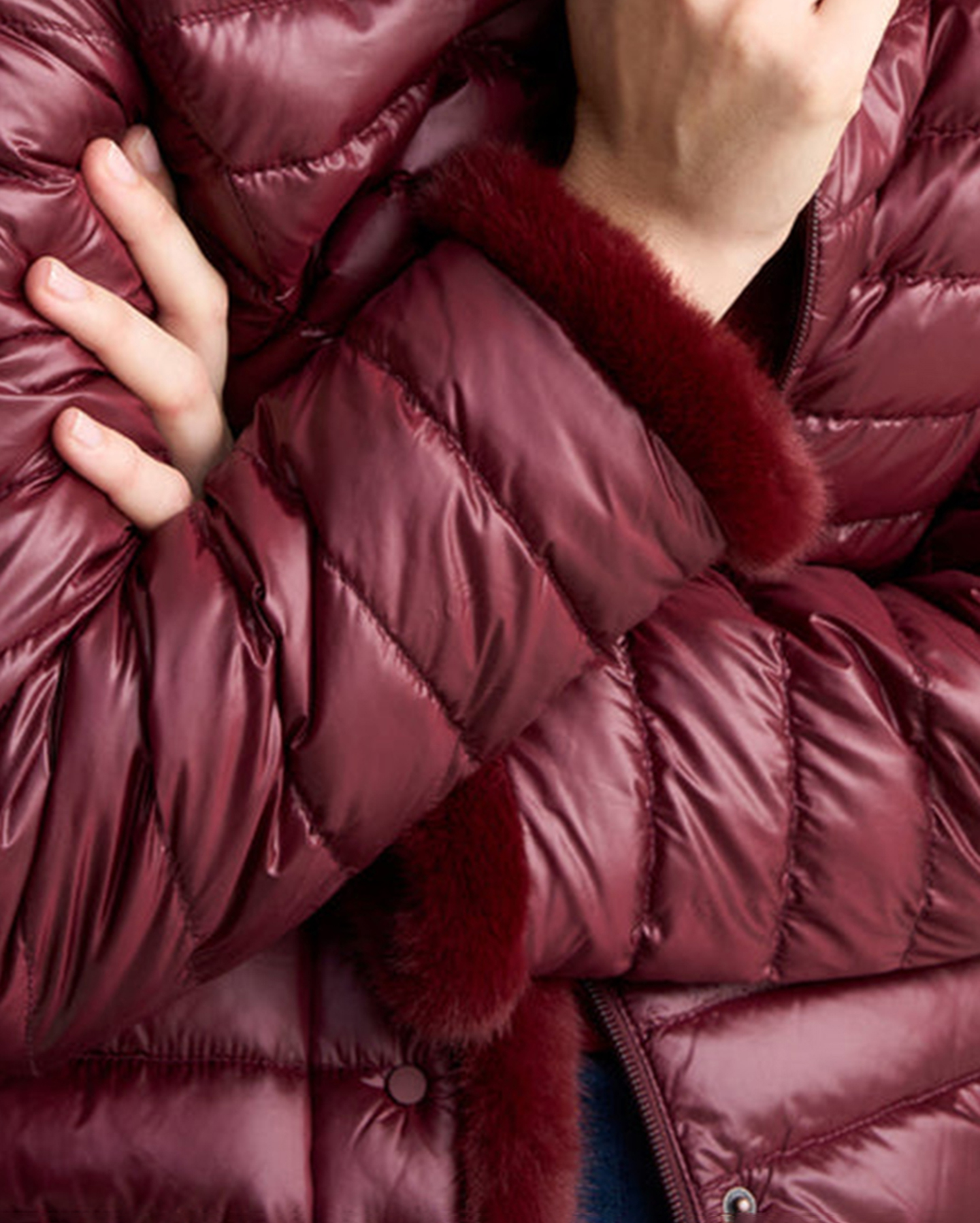 - Faux fur trim along centre, collar and cuff