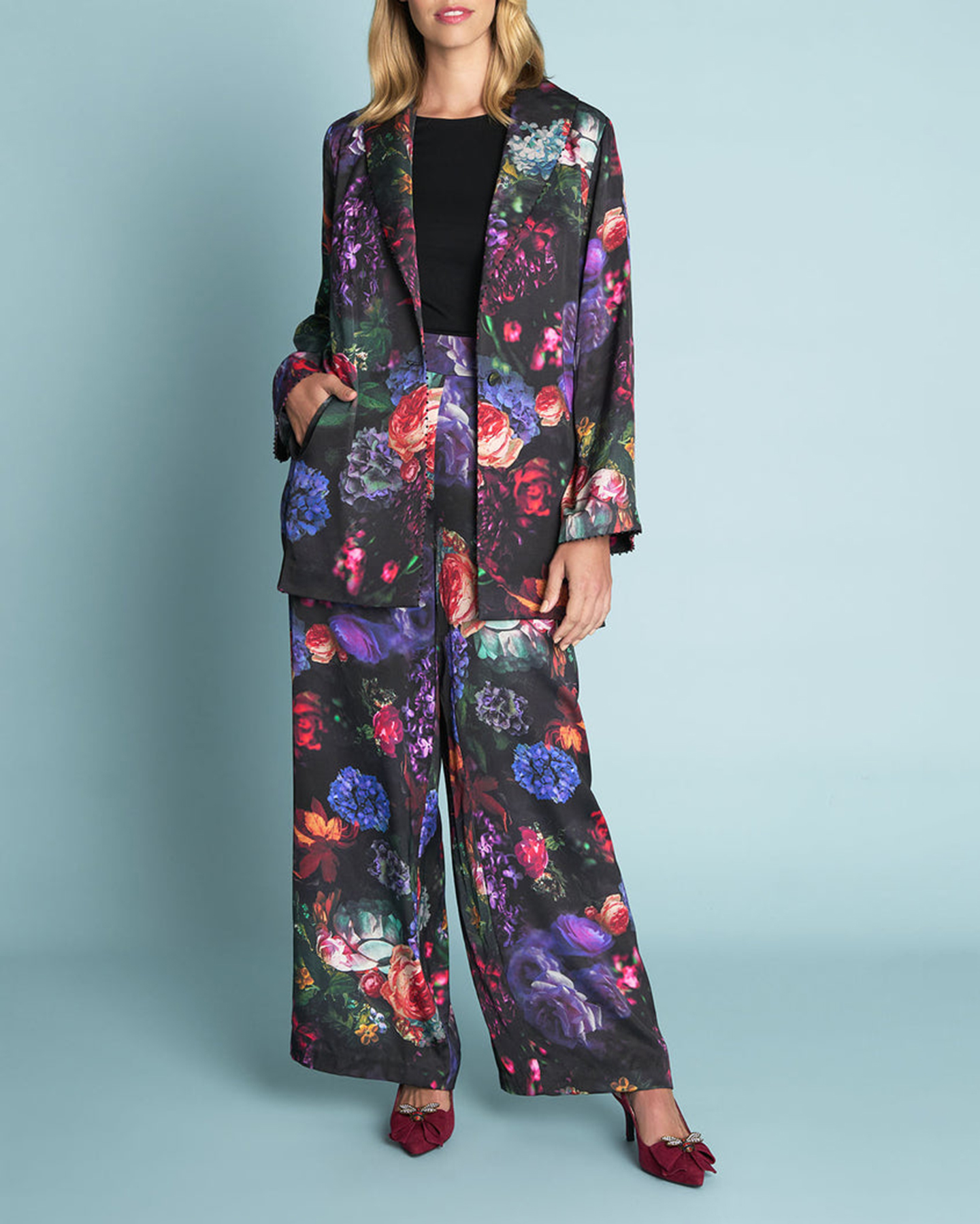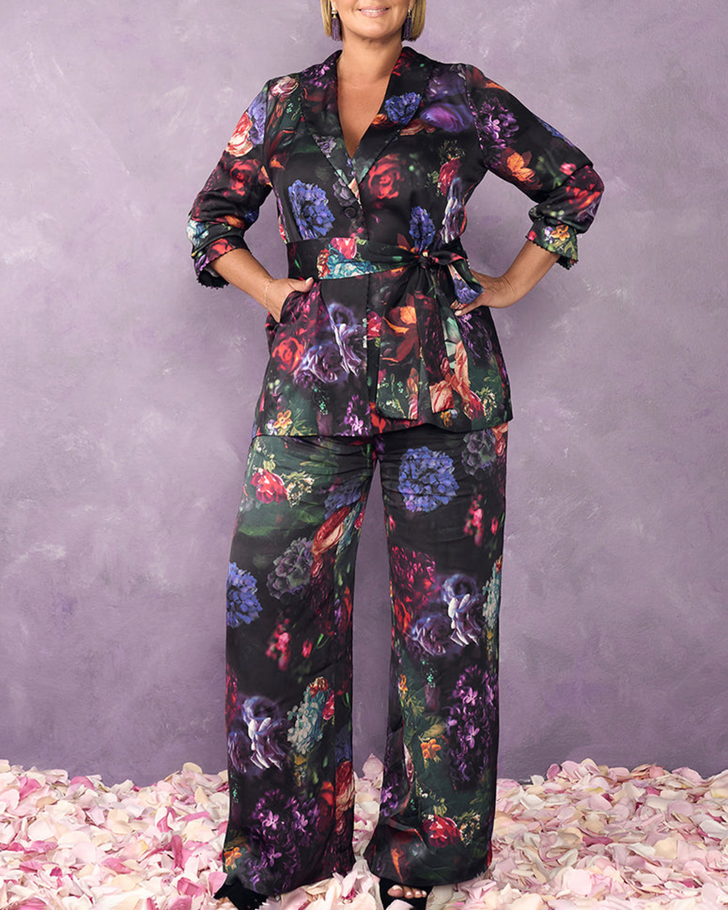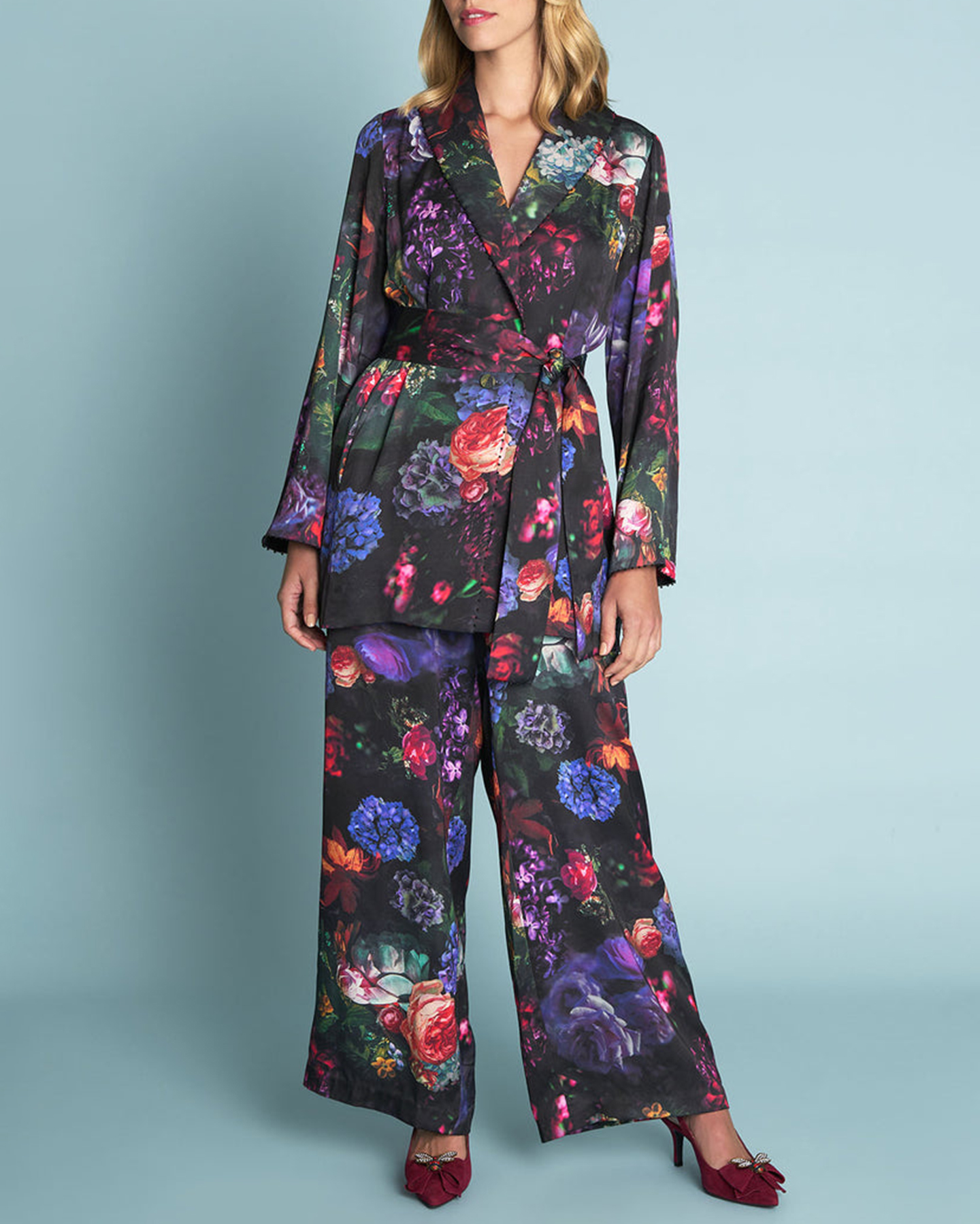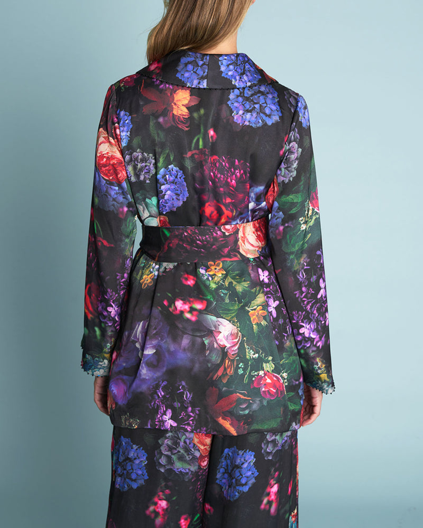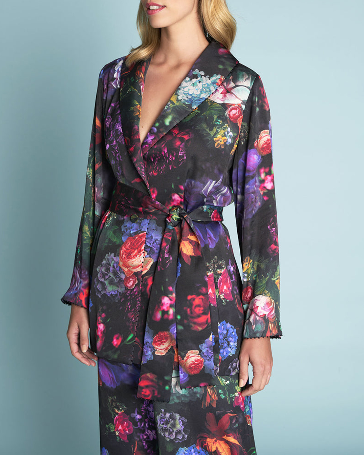 - Beaded trim along neckline cuff and belt