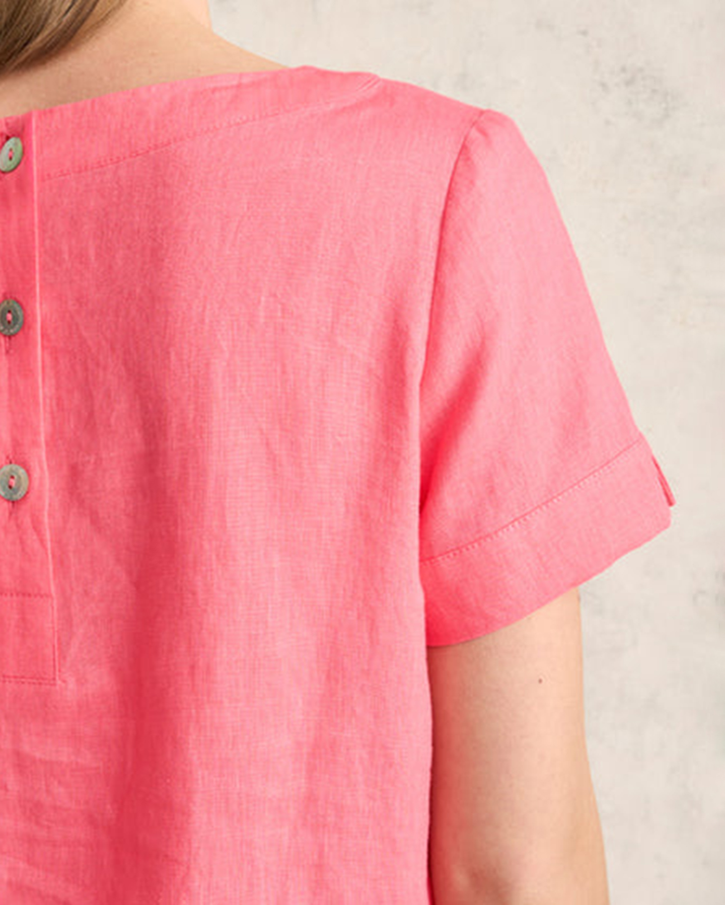 - Centre back placket with natural shell buttons